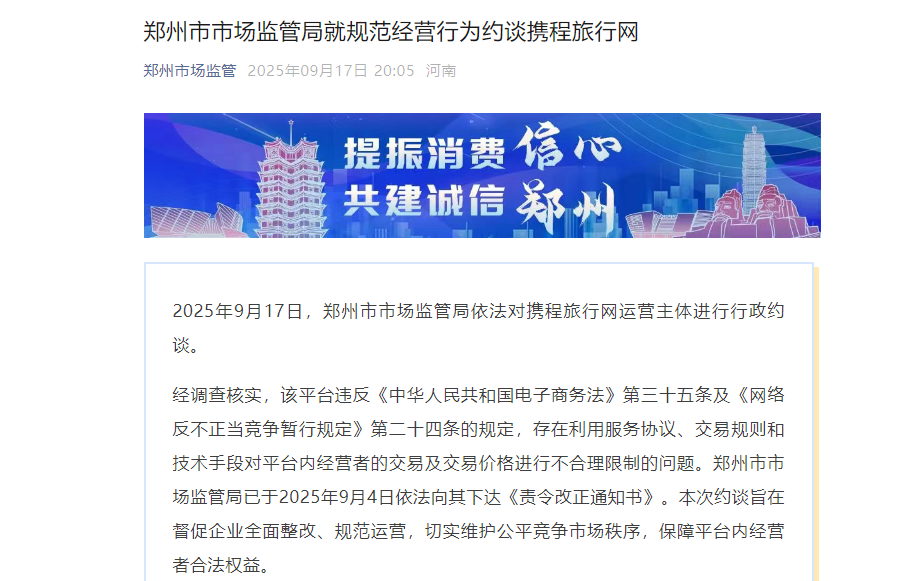 2025年9月17日,郑州市市场监管局依法对携程旅行网运营主体进行行政约谈。对于后续如何整改,携程官方客服表示:“目前此事我司己在积极处理当中。”