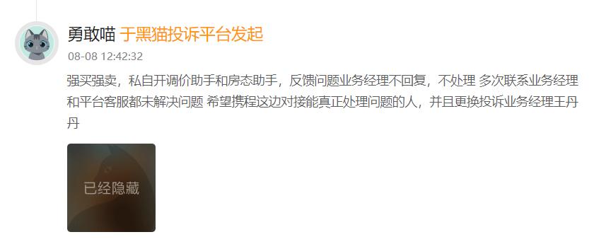 直至8月8日,仍有商家在黑猫投诉平台控诉称,(携程)私自添加“调价助手”和“房态助手”,就此事联系负责的业务经理和平台客服,均未获得任何回复或有效处理。