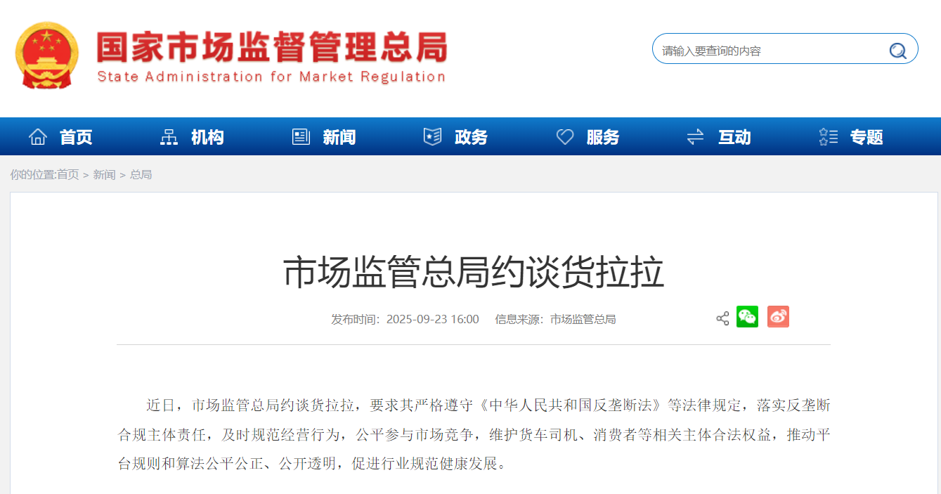 大公科技讯 9月23日,国家市场监督管理总局发布信息显示,近日,市场监管总局约谈货拉拉,要求其严格遵守《中华人民共和国反垄断法》等法律规定,落实反垄断合规主体责任,及时规范经营行为,公平参与市场竞争,维护货车司机、消费者等相关主体合法权益,推动平台规则和算法公平公正、公开透明,促进行业规范健康发展。