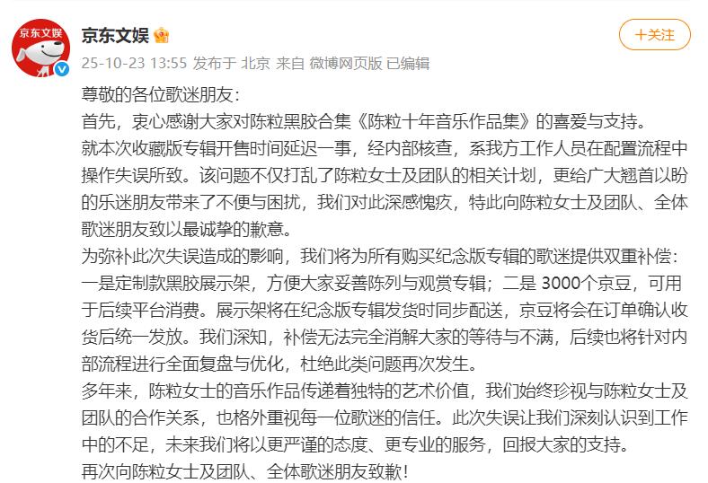 10月23日下午,京东文娱发文致歉:衷心感谢大家对陈粒黑胶合集《陈粒十年音乐作品集》的喜爱与支持。就本次收藏版专辑开售时间延迟一事,经内部核查,系我方工作人员在配置流程中操作失误所致。该问题不仅打乱了陈粒女士及团队的相关计划,更给广大翘首以盼的乐迷朋友带来了不便与困扰,我们对此深感愧疚,特此向陈粒女士及团队、全体歌迷朋友致以最诚挚的歉意。