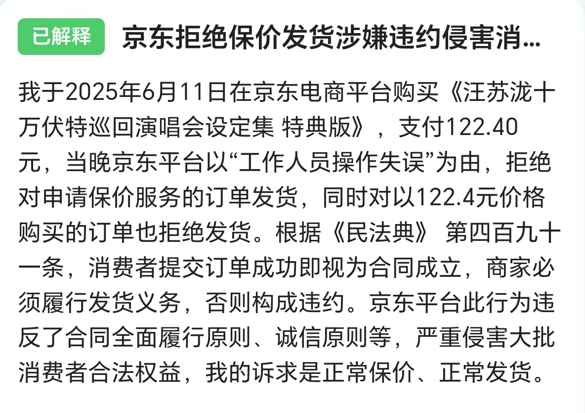 投诉者表示,京东平台此行为违反了合同履行原则、诚信原则等,严重侵害大批消费者合法权益。