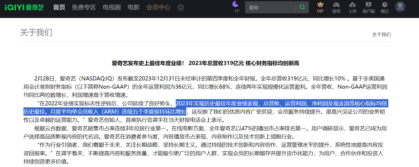 值得一提的是,通过持续压缩内容成本、提升运营效率等举措,爱奇艺曾成功扭转亏损局面。在爱奇艺官网上,该公司认为其发布的2023年财报为“史上最佳年度业绩”,彼时,其创下总营收、运营利润、净利润及现金流等核心指标的历史最佳表现,月度平均单会员收入(ARM)曾连续五个季度保持环比增长。