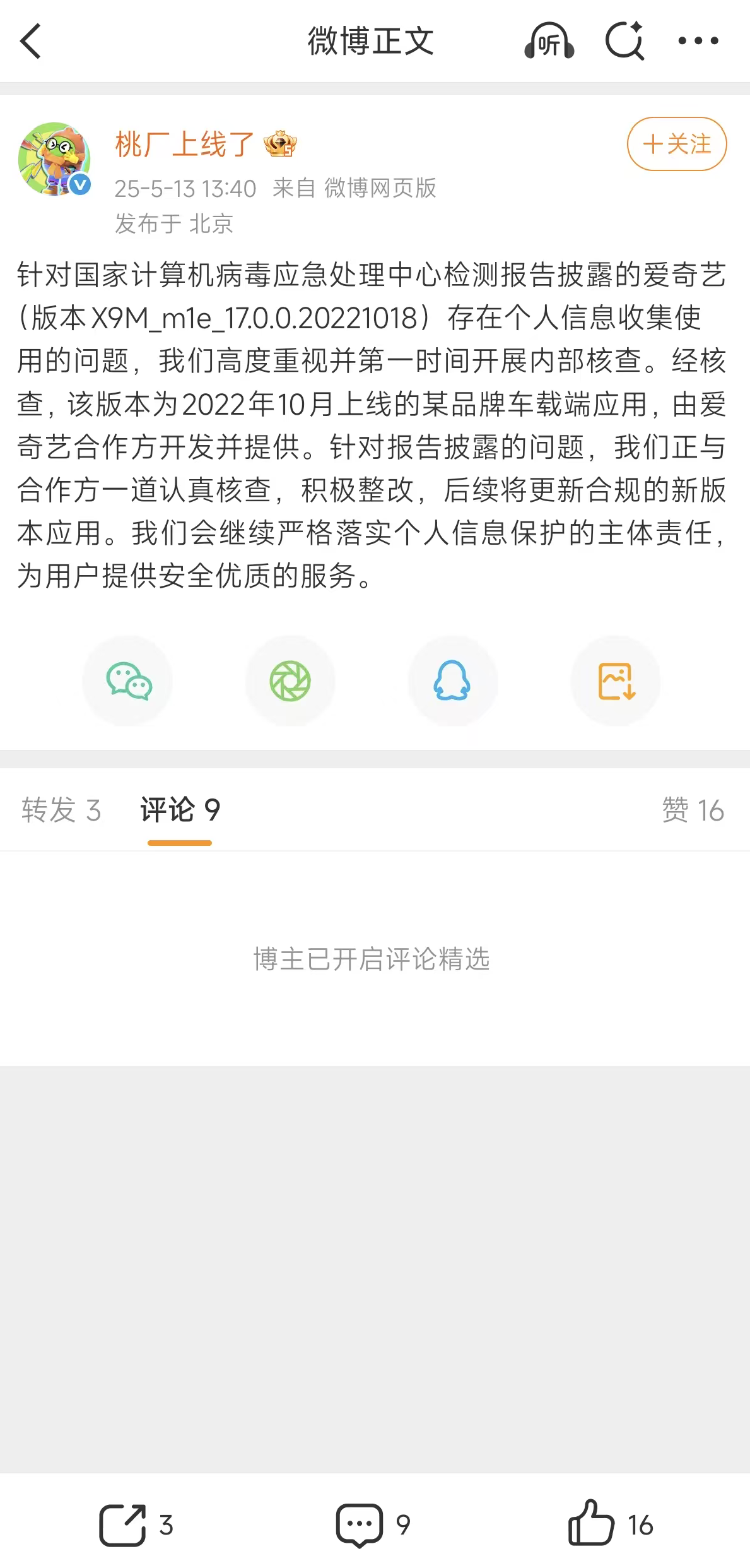 事件引发广泛社会关注,“爱奇艺违法收集个人信息”等相关话题在微博平台持续发酵。2025年5月13日,爱奇艺通过其“桃厂上线了”微博账号回应,称问题出在第三方合作开发的旧版本应用,并承诺与合作伙伴整改并推出合规新版本。然而,该回应因开启“评论精选”功能而被质疑缺乏诚意,未能平息舆论。