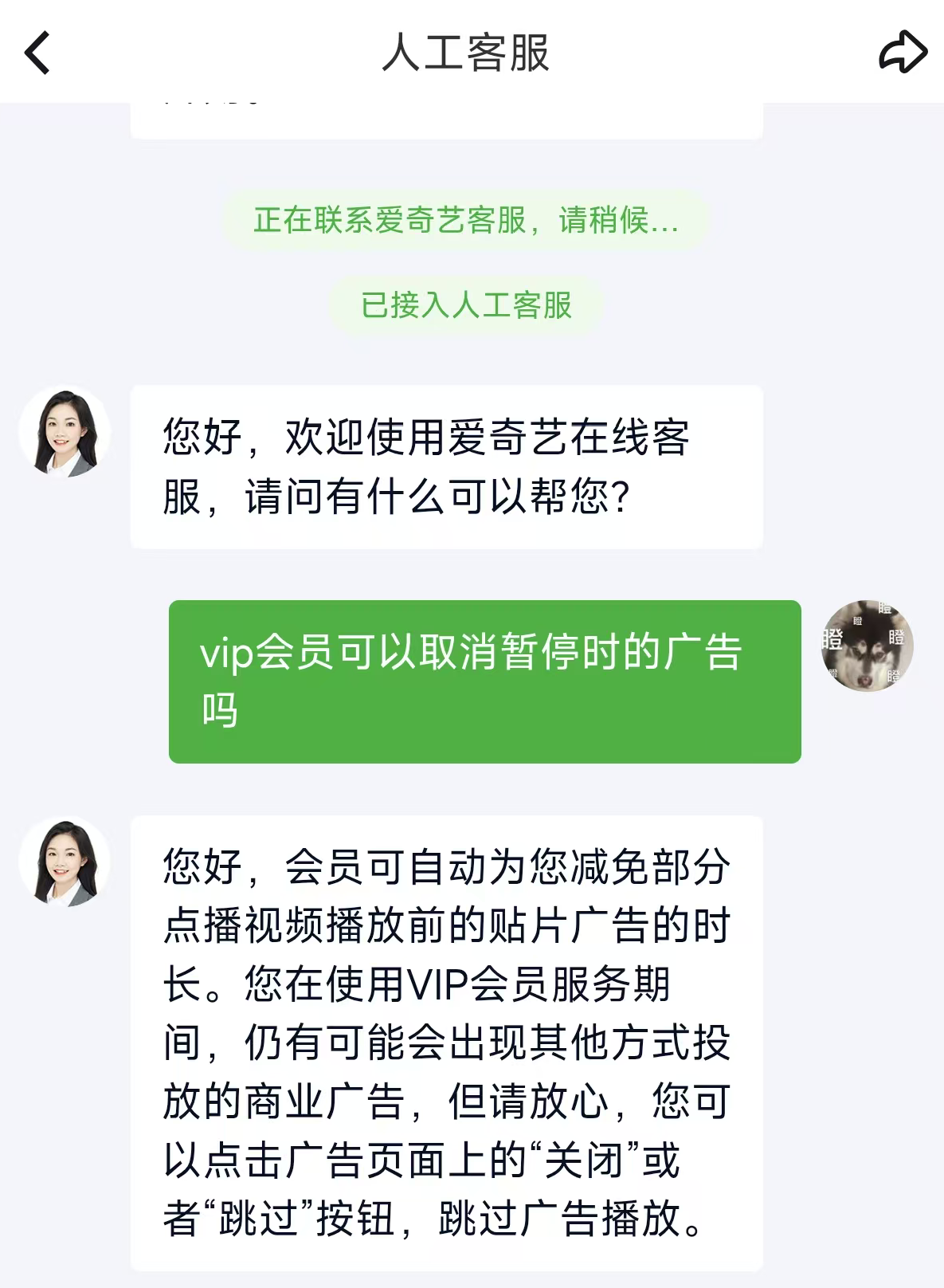 对于暂停视频后大幅广告遮挡住原视频的定格画面,爱奇艺人工客服回应称,会员可自动为您减免部分点播视频播放前的贴片广告的时长。在使用VIP会员服务期间,仍有可能会出现其他方式投放的商业广告,但可以点击广告页面上的“关闭”或者“跳过”按钮,跳过广告播放。