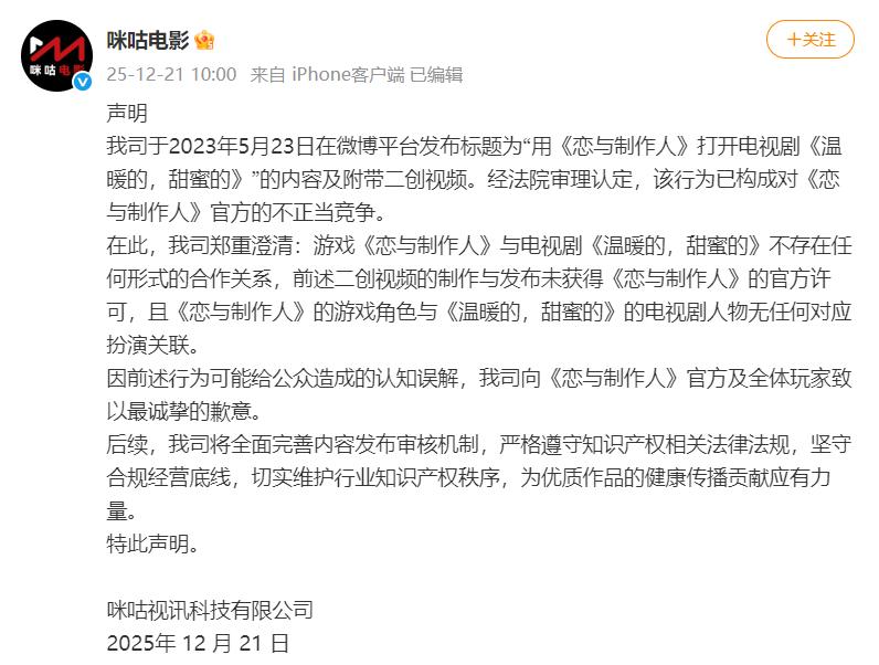 大公科技讯 12月21日,咪咕视讯科技有限公司(以下简称“咪咕视讯”)通过“咪咕电影”官方微博发布致歉声明,针对2023年公司在微博平台发布标题为“用《恋与制作人》打开电视剧《温暖的,甜蜜的》”的内容及附带二创视频,经法院审理认定,该行为已构成对《恋与制作人》官方的不正当竞争。