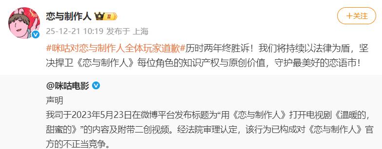 同日,《恋与制作人》官方微博转发该声明并表态:“历时两年终胜诉!我们将持续以法律为盾,坚决捍卫每位角色的知识产权与原创价值。”