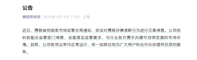 据携程黑板报消息,1月14日,携程发布公告称,公司将积极配合监管部门调查,全面落实监管要求,与行业各方携手共建可持续发展的市场环境。目前,公司各项业务均正常运行,将一如既往地为广大用户和合作伙伴提供优质的服务。