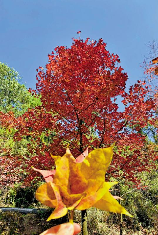 还好大棠红叶十分密集,而且树身较矮,每棵树下人头涌动,无数手机对着头顶一阵狂拍。既然来了,任谁也想有几张以红叶作背景的人像照吧。我们于人群中左穿右插,终于来到树下,仰头望去,蓝天像背景板,树树深红出浅黄,阳光洒向盛放的枫,向阳微笑的叶子,愈发生动明艳。拈一片小叶,满眼“枫”光,瞄准一片枫,拍出百般靓。