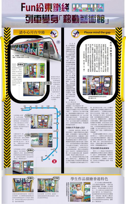 从北区的山野意趣自然风光,到油尖旺的市井味道,再到摩登现代的核心商业地带金锺,全长约四十六公里、共十六个车站的东铁綫沿綫社区各具特色。为了令乘客在全程约五十分锺的东铁綫旅程中更好地感受香港的文化特色,本月起,一辆名为“东铁綫.Fun纷艺术”的列车悄然启程,港铁公司通过与香港艺术家和沿綫学校的学生合作,将社区的独特风貌带进列车,乘客可以一边欣赏艺术作品,一边发掘及游历各社区的独特风貌。\大公报记者 徐小惠(文、图)