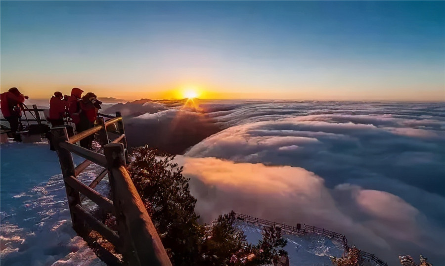 冬季的老君山降雪频繁,雪后常伴随着云海奇观,大小山峰、千沟万壑都淹没在云涛雪浪里,波澜壮阔,一望无边。