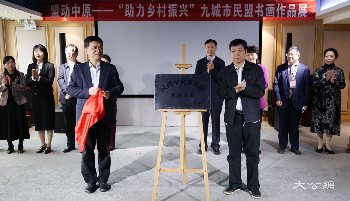 河南省政协常委、民盟河南省委会专职副主委柳锋波(右),开封市人大常委会副主任徐同君为“民盟中央美术院开封分院”揭牌