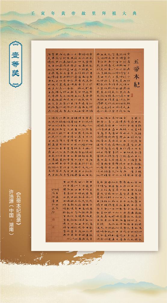 其中,河南作者方申奥的《阎慰鹏·黄帝颂》、湖南作者许浩源的《五帝本纪选录》获得书法一等奖。