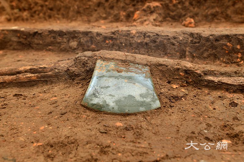 这是12月10日在河南南阳黄山遗址拍摄的屈家岭文化高级别大型墓葬中随葬的玉钺。