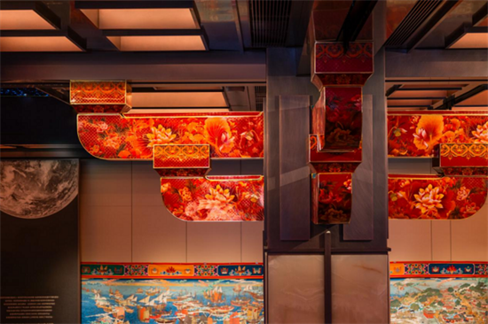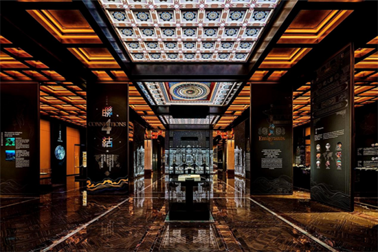 博物馆的设计通过现代建筑语言赋能中国传统非遗工艺,展厅廊柱呈现景泰蓝掐丝珐琅工艺与中式斗拱智慧,并结合围绕“一带一路”沿线主要国家的文物与艺术元素,重构文物及空间叙事,彰显历史价值,衬托文化底蕴。博物馆通过藻井轨道顶结构、可移动LED屏和活动展板,成就模块化、高度灵活性的可变展览布局,创新传统展览策展手法。