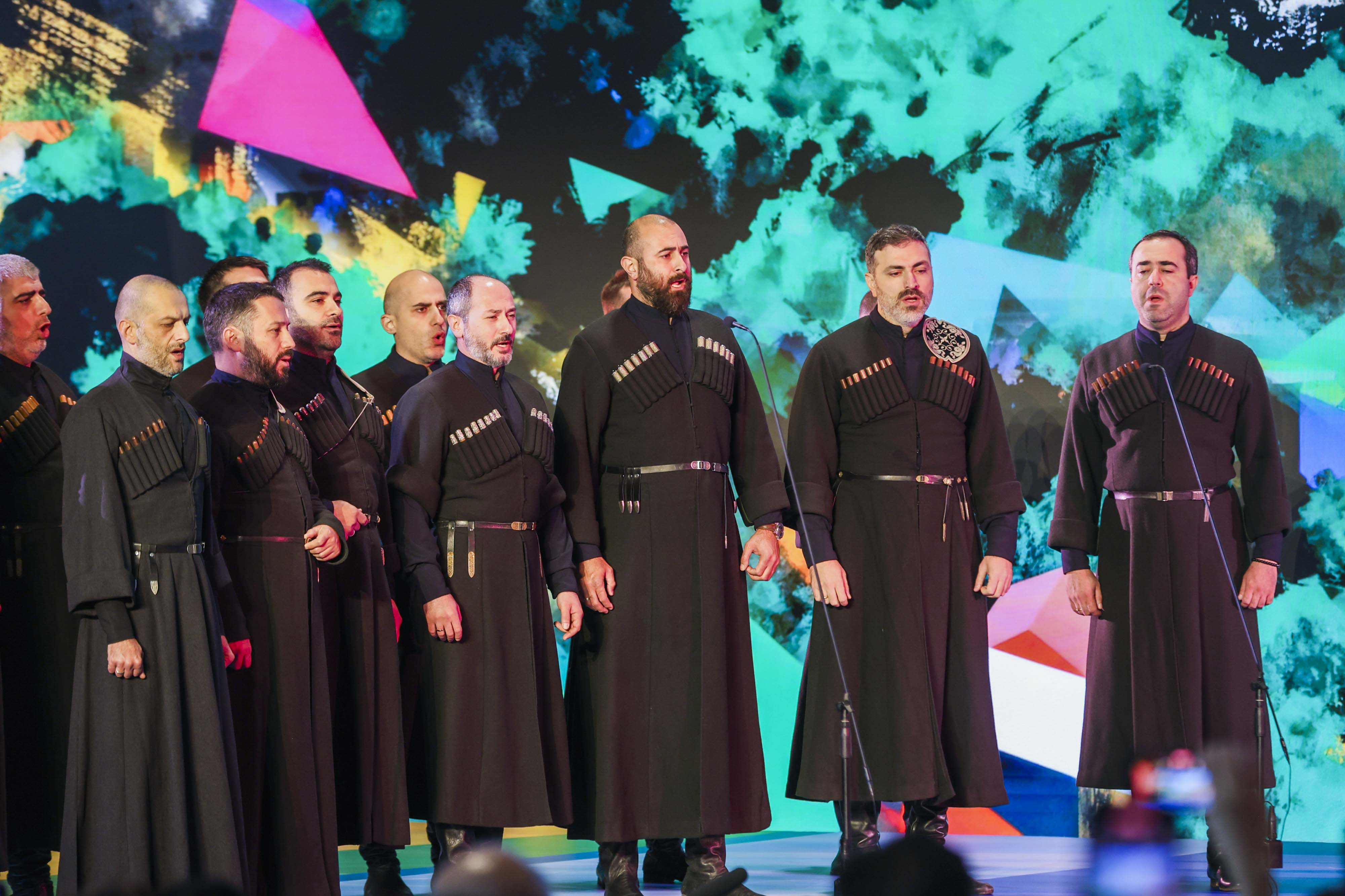 整场演出铺陈开一幅中外美学交融的画卷。在“风·和鸣”篇章中,来自中国贵州的侗族大歌与格鲁吉亚复调演唱同台,清丽婉转的侗族多声部大歌与雄浑辽阔的格鲁吉亚复调叠韵相和,两种源自不同文明的多声部演唱形式在舞台上交织,构成了一场跨越山海的文明对话。