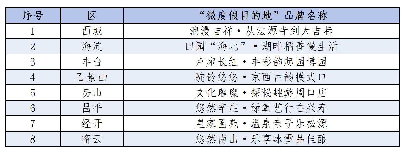第三批“北京微度假”目的地品牌由北京市文化和旅游局联合西城区、海淀区、丰台区、石景山区、房山区、昌平区、密云区以及经开区推出,分别是:“浪漫吉祥·从法源寺到大吉巷”“田园‘海北’·湖畔稻香慢生活”“卢宛长红·丰彩韵起园博园”“驼铃悠悠·京西古韵模式口”“文化璀璨·探秘趣游周口店”“悠然辛庄·绿氧艺行在兴寿”“皇家囿苑·温泉亲子乐松源”“悠然南山·乐享冰雪品佳酿”。8个“北京微度假”目的地总体呈现出8个适合微度假休闲的旅游片区,拥有文旅商体等多种业态,消费场景多元,各有特色、各有玩法,为市民游客“微旅行”“宅度假”提供了新选择。