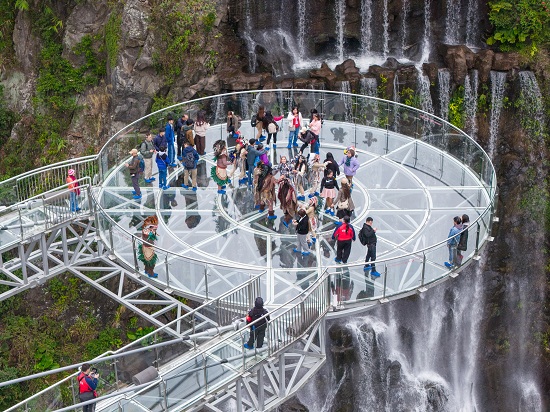 全园情景互动,将山水之旅变身沉浸剧场,“部落野人”不再局限于单一舞台,而是自然融入各个核心景点,与游客进行即兴、友好的互动。落差378米的大瀑布前,“部落战士” 演绎激昂战舞;530 米高空的“云天玻霸”上,“原始野人”与克服恐惧的游客击掌庆祝。不少游客驻足拍摄,孩子们模仿舞步,快门声与欢笑声交织成独特的跨年交响。“刚走到瀑布前,突然有‘野人’从树丛里跳出来,吓我一跳!”游客王女士笑着分享,“但他们的表演太精彩了,孩子追着跟了一路,还学他们‘嗷嗷’叫!”
