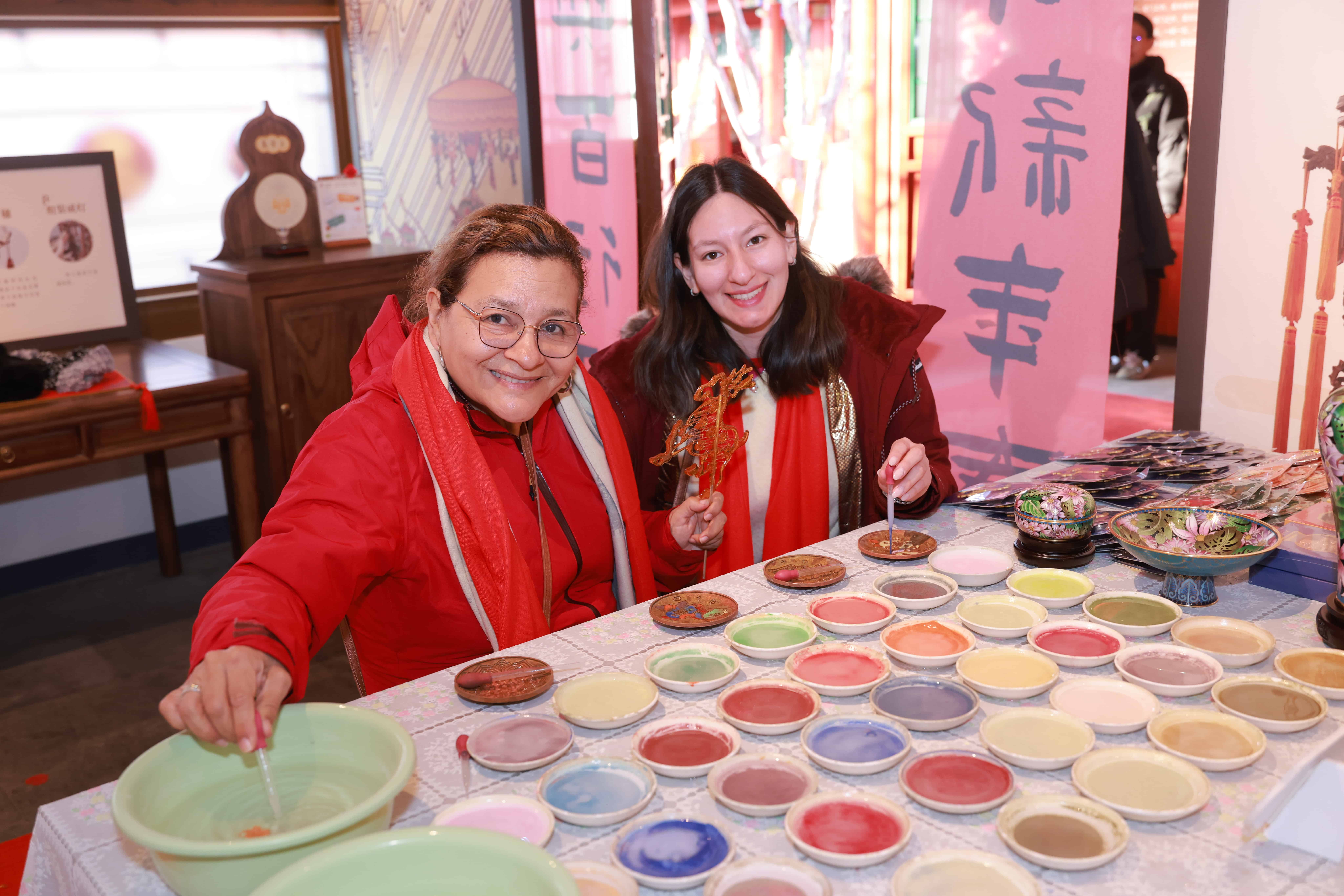 活动聚焦非遗体验亮点。在书法体验区,大家执笔蘸墨,认真书写福字与英文趣味春联,在笔墨流转中感受中国书法的独特韵味;景泰蓝点蓝体验中,外籍友人亲手为铜丝纹样填抹釉料,指尖感受国家级非遗技艺的精细与匠心;盛锡福皮帽体验区,大家试戴百年非遗皮帽,聆听传统技艺背后的文化故事;宋代点茶与古琴艺术相得益彰,茶香袅袅、琴音悠扬,让外籍友人沉醉于中式雅致生活美学;北京泥人张体验现场,大家跟随非遗传承人亲手创作憨态可掬的彩塑小马,以“马”这一文化符号,读懂“马上如意、马上福禄”的新春祝福,搭建起中外情感共鸣的桥梁。