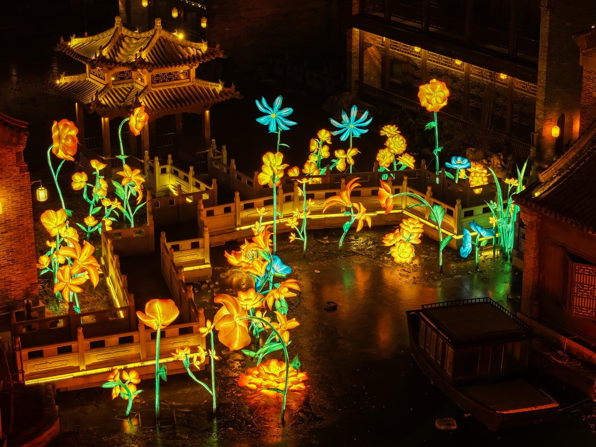 夜幕降临,憨态可掬的太极街猫灯、美轮美奂的水中花灯、姹紫嫣红的街区花灯等七千余盏华灯在小镇点亮,伴随着星光打铁花、国潮新春烟花秀等迎春节目,一同照亮小镇新春的夜空,璀璨画面等待游客前来打卡。