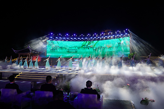如梦如幻、诗情画意的主题演绎《如愿齐云山》正式开演,歌舞情景表演和烟花秀相融合,让人耳目一新,天开神秀、烟雨横江、逍遥齐云、福至如愿……一幕幕场景精彩绝伦,演绎着齐云山的秀美山水、历史人文。表演尾声,以夜为幕,漫天璀璨烟花,装点盛世光景,将大会气氛推向高潮。