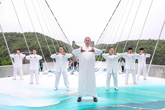 武当太极传人王明山、李在峰与长沙市恒定高级中学学生在玻璃桥上演练八段锦和太极拳。(主办方供图)