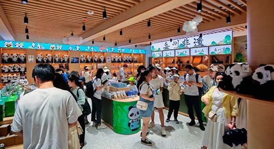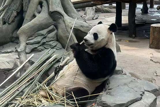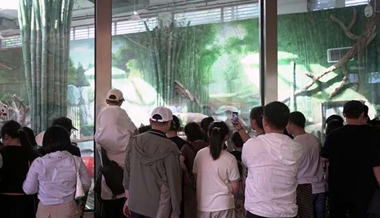 在大熊猫场馆内,大熊猫们悠闲地啃食竹子,时而与游客欢乐互动,在熊猫科普馆内,眼花缭乱的熊猫科普知识,同样让游客们应接不暇。