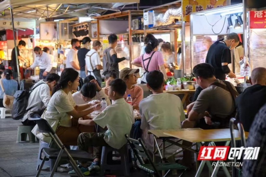 夜晚的长沙街头坐满了享受假期生活的食客。(张必闻摄)