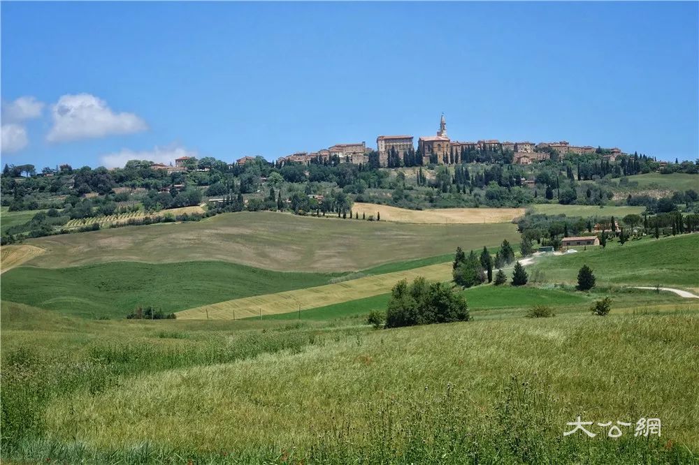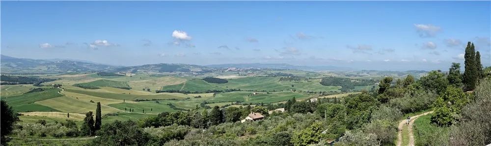 在自行车租赁店租上一辆座驾,戴上头盔,把手机绑在车把上,打开地图;店主Stefy 给我的背包上系了条荧光带,说了句“Buon viaggio”(旅途愉快)。突然有了种穿山越岭的情绪:原来自己经历了一场交通工具的接力赛。这一路先是从布拉格飞到米兰,高铁到佛罗伦萨,又坐老式火车到锡耶纳,再转汽车到皮恩扎,现在跨上自行车进入山谷。同行者愈发寥寥,终于到了最后一棒。