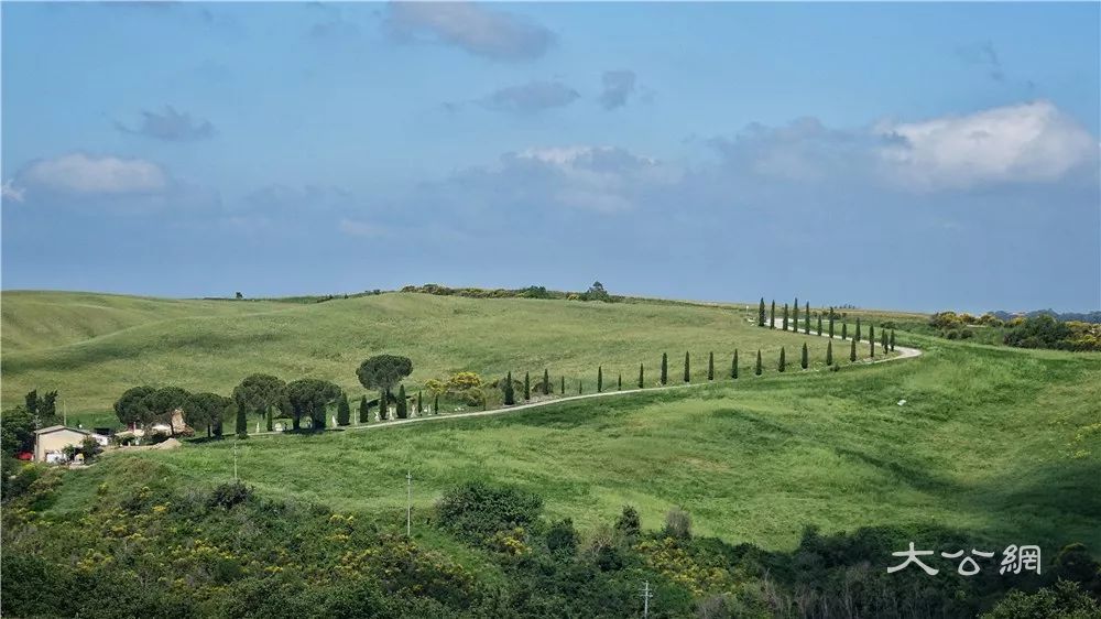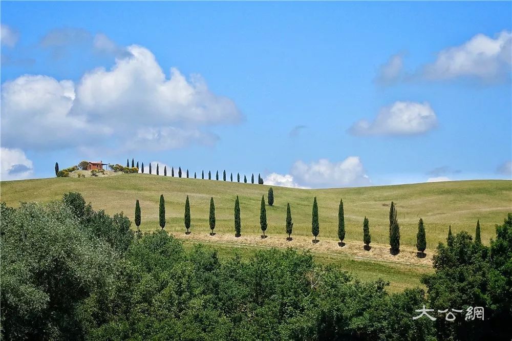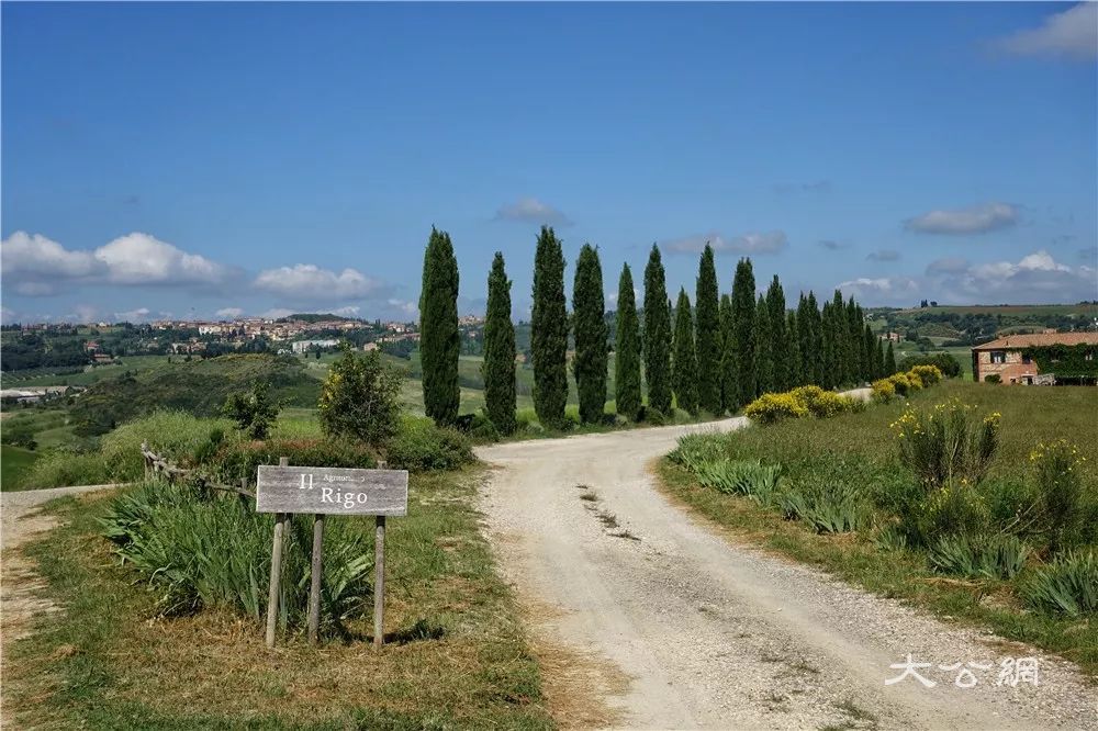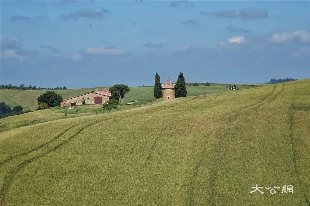 经过一段修葺完好的公路,就真正进入了骑行的路线。轮胎在颠簸中不时把碎石弹起,耳边只有风声和麦浪的窸窣。蝴蝶不怕人,飞到我的手上,还会停留片刻。松樟之间,偶尔仍有房屋,与其他骑行者狭路相逢,距离够的时候会击掌,再互道一声“Ciao”,你好和再见都在同一刻。