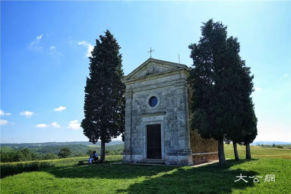 过了一会儿,面前出现一扇铁丝网门,不知被谁挖了个洞,刚好容得下一个人进出。往远一看,原来这是通向“小耳朵教堂”(Cappella della Madonna di Vitaleta)的一条捷径。大喜,推着车子钻进去,再沿土路骑一小段,就到了教堂跟前。这教堂的俏皮昵称,来自于它两旁的柏树。