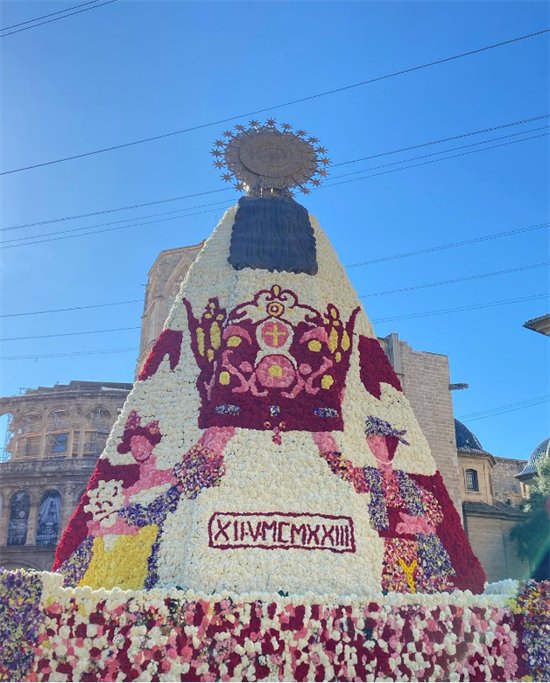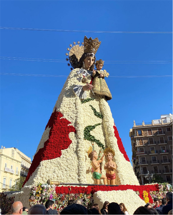 第一天,15米高的圣母像仍然是木架的状态,法雅小姐和法雅先生献上鲜花逐渐将圣母像的外袍装饰一新。到第二天结束时,圣母像的外袍被17吨鲜花覆盖,展示出代表该年度的圣母像设计,2023年圣母像外袍的图案是庆祝圣母加冕百周年。