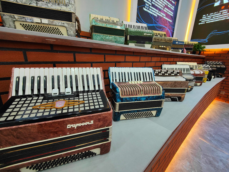 近千架手风琴被精心收藏在1200平方米的展馆里,分两个展厅展示。一个展厅主要展陈国产手风琴,那些在上世纪六七十年代红极一时的名牌手风琴,如东方红、百乐、长江、鹦鹉、火炬等品牌都可以看到;另一个展厅主要收藏国外手风琴,有俄罗斯、德国、意大利、乌克兰等10个国家的品牌手风琴。据说,在全国的手风琴馆中,这里的藏品数量和品类名列前茅。