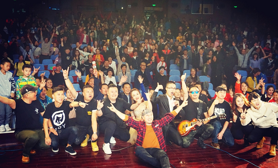 风筝乐队在五家渠市文化中心演出结束时与现场观众合影。(张琳琳 摄)