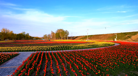 五家渠青格达湖旅游风景区,夕阳下的郁金香。(祁佳萍 摄)