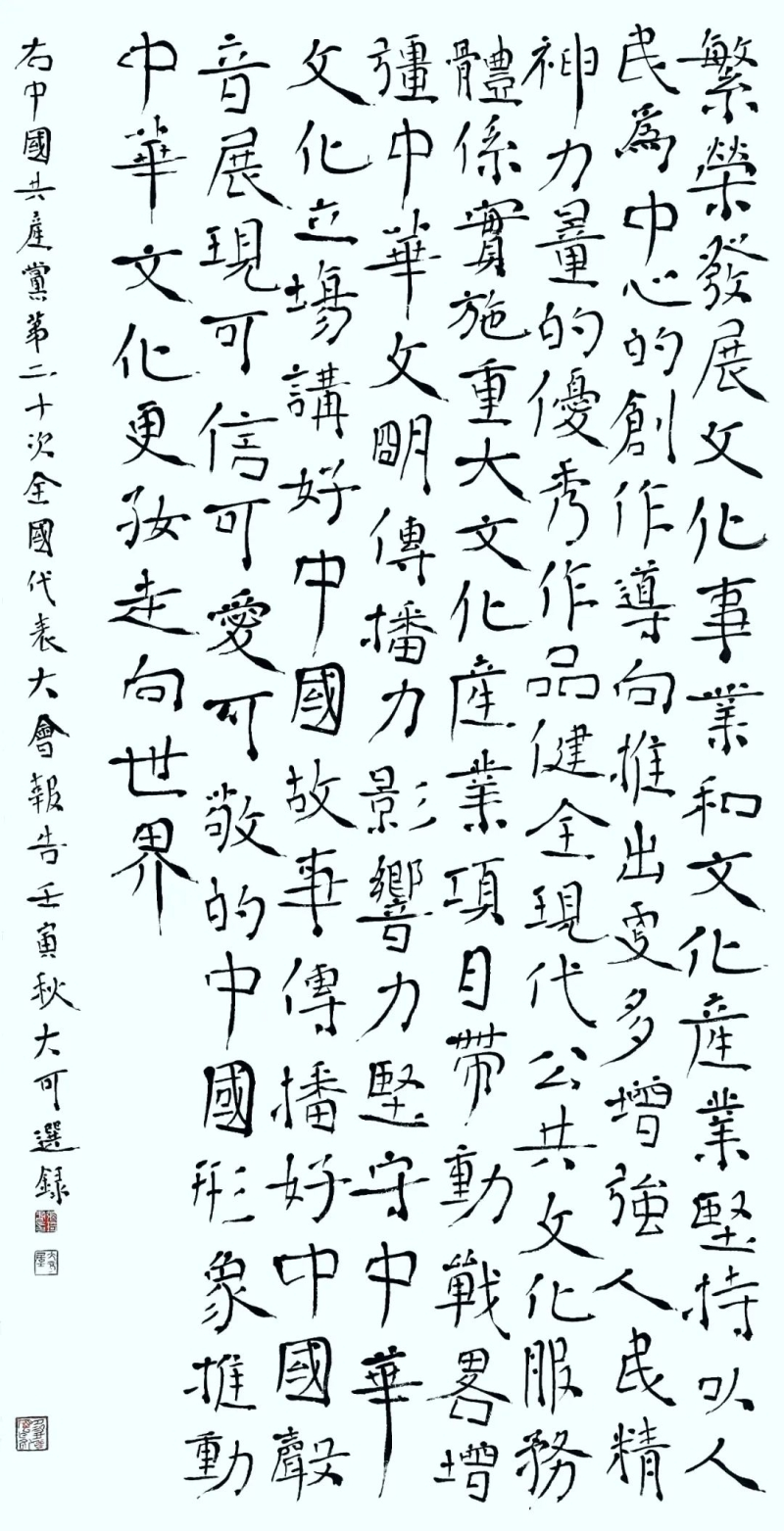 新疆文化馆举办“豪情书金句 奋斗向未来——庆祝党的二十大胜利召开新疆书法展”,邀请30位书法家书写党的二十大报告内容。“活动以书法和篆刻宣传党的二十大精神,为全面建设社会主义现代化国家贡献文艺力量。”新疆文化馆研究馆员张琦介绍,后期还将邀请更多书法家参与活动,并组织各地州市文化馆加入,通过书法作品表达全疆书法爱好者永远跟党走、奋斗向未来的决心和信心。