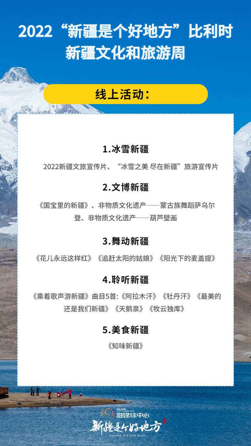 2022“新疆是个好地方”新疆文化和旅游周以线上和线下结合的形式举办。在启动仪式现场,播放了《新疆是个好地方》宣传片,向海外公众展示了新疆巍峨雪山、沙漠绿洲、石窟壁画、高山峡谷、草原湖泊等壮美景色,和谐稳定、生态良好、文化繁荣的美好景象。