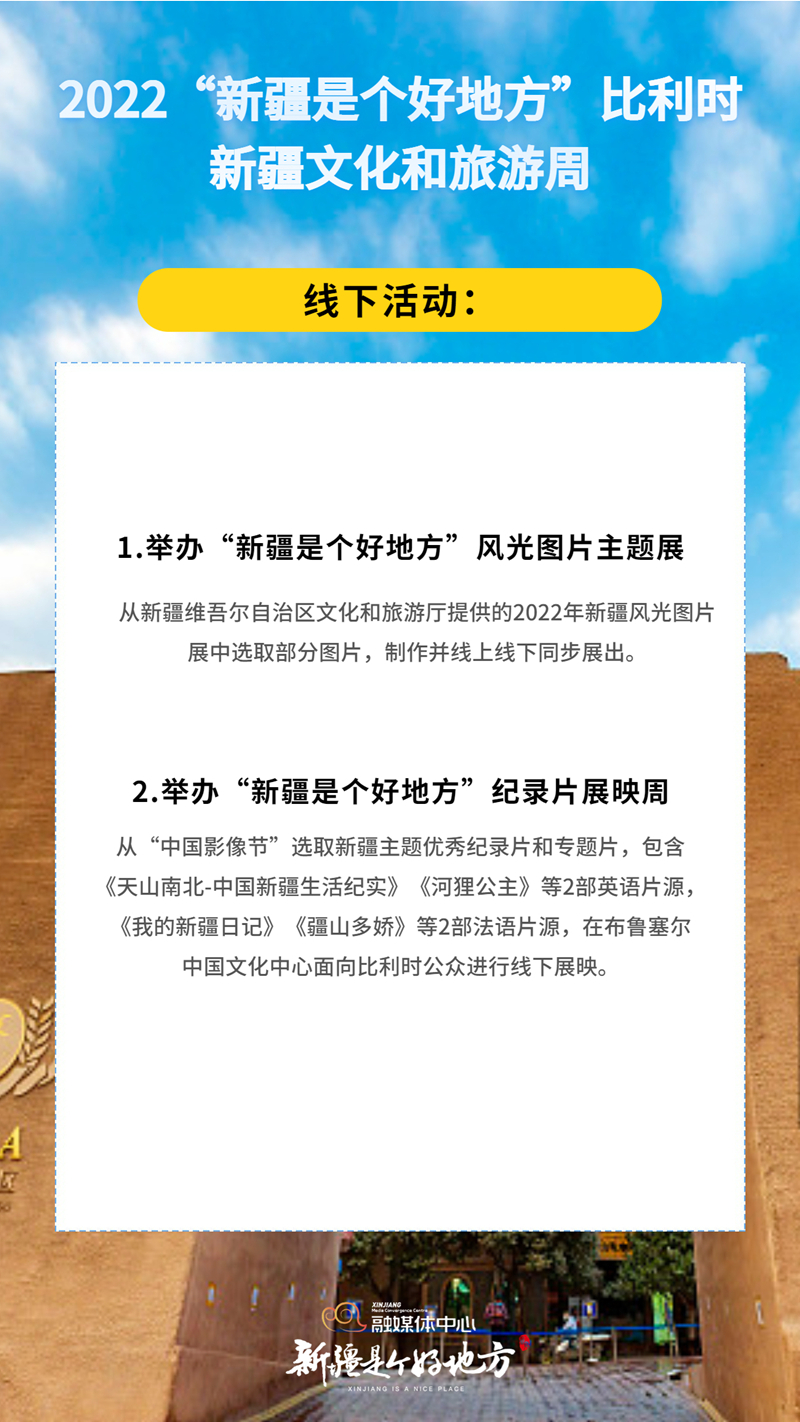本次活动期间,中国驻比利时大使馆、布鲁塞尔中国文化中心将在主流网站及社交媒体平台,陆续推出主题为“冰雪新疆”“文博新疆”“舞动新疆”“聆听新疆”“美食新疆”的宣传片、纪录片、微综艺等精彩内容;在布鲁塞尔中国文化中心举办“新疆是个好地方”风光图片主题展、“新疆是个好地方”纪录片展映周活动。这些活动将让海外民众感受中国新疆的人文风情、自然美景、现代时尚和开放包容,领悟新疆人文和自然之美。