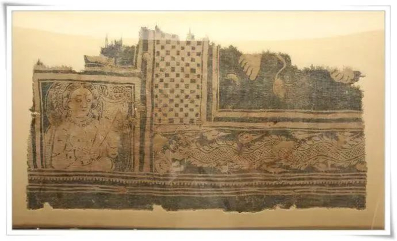 这块棉布目前藏于新疆博物馆,它在1959年10月出土于和田地区尼雅遗址一座贵族合葬墓中,棉布残长89厘米、宽48厘米,图案用边框分成了4部分内容,看上去有点像今天的版画。中心部分图案仅残存半只脚和一条狮尾;下方长条形区域里,一只怪兽咬着一条“龙尾”,“龙尾”上下还有正在飞翔的小鸟;左下角图案保留最完整,呈正方形,边长约32厘米,里面有一个半裸女子,她侧身斜视,神态端庄,面露微笑,身后有一圆形光环,手中持一个角状容器,容器里装满了果实;左上角图案仅剩下残边,已无法辨认。