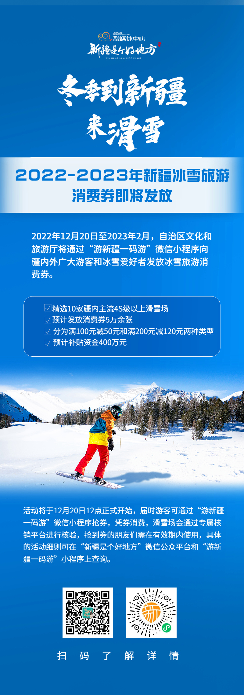 新疆维吾尔自治区文化和旅游厅旅游宣传推广中心李勐介绍,此次活动预计发放消费券5万余张,分为满100元减50元、满200元减120元两种类型,预计补贴资金400万元,活动将于12月20日12时正式启动,届时,游客可通过“游新疆一码游”微信小程序抢券。