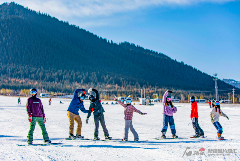 12月11日,丝绸之路国际度假区里,雪友们正在合影留念。 翟廷飞摄