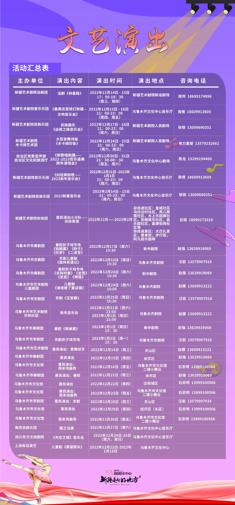 2.可通过乌鲁木齐市文化和旅游局微信公众号,微信搜索“乌市文化中心”小程序等渠道关注演出信息或购买观演门票。