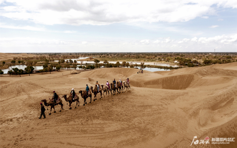 游客在尉犁县罗布人村寨景区骑骆驼游玩。李飞摄