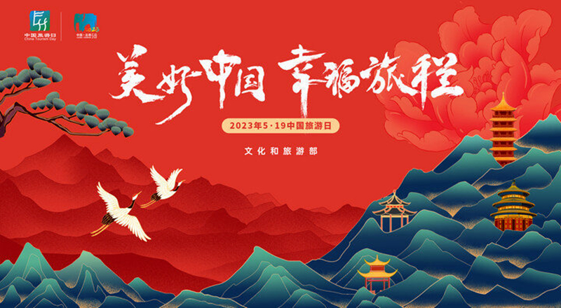 2023年“5·19中国旅游日”宣传推广主视觉:以“中国红”为主色调,集合了牡丹、青松、白鹤、亭台楼阁等中国传统元素,整体画面呈现为:千里江山,牡丹花开,青松白鹤,山川绵延,寓意国家繁荣昌盛,富贵祥和,人民幸福安康,与自然和谐共处。主视觉风格大气,展现中式美学,旨在以华夏大地的山河锦绣、人文璀璨,深刻表达中国人民对生活的美好期待和中华民族的美好未来。
