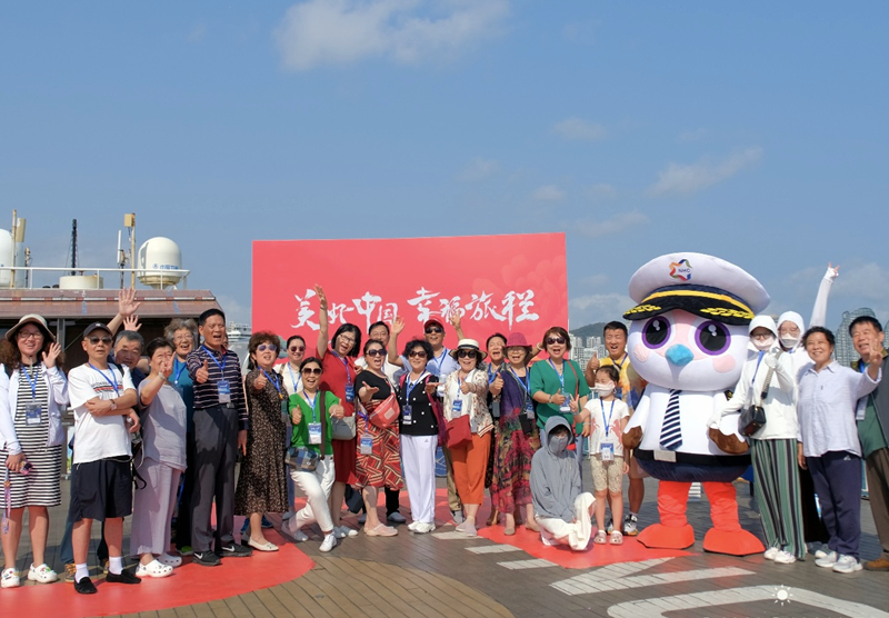图为游客在“5·19中国旅游日”主题邮轮甲板上进行打卡拍照