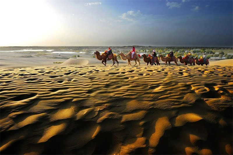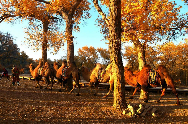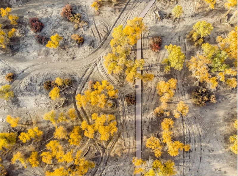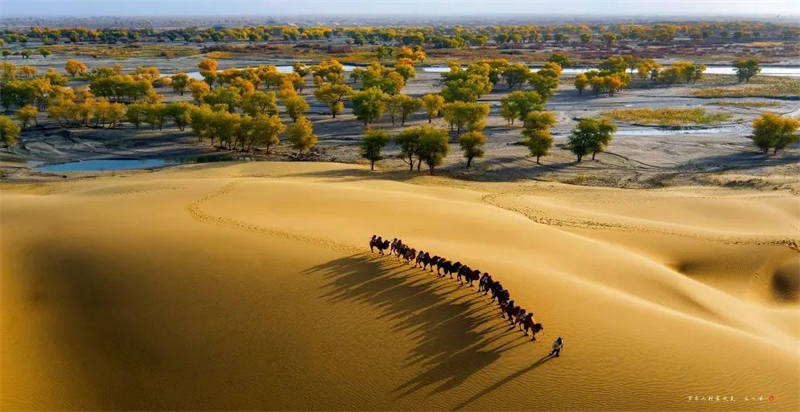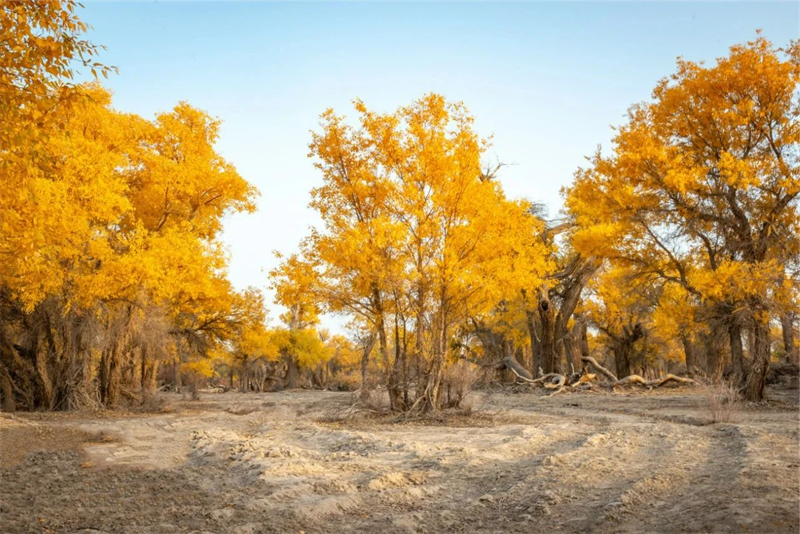 粗干虬枝、伞盖如云的胡杨,将金黄的叶片在狂风之中挥舞,阐释着生命的顽强与辉煌。这荒漠之中的伟大生命所缔造的壮美,早已成为新疆精神的象征。