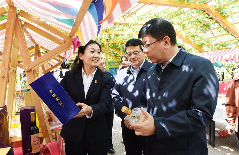 吐鲁番市领导在巡视吐鲁番农产品展位,了解桑葚酒生产销售情况。