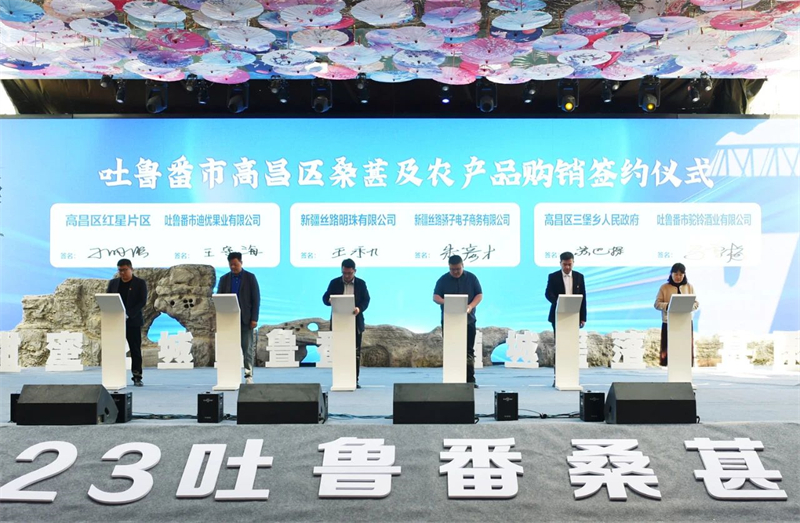 吐鲁番市委副书记、市长克衣色尔·克尤木宣布“甜蜜之城吐鲁番 满城摇落桑葚雨”2023吐鲁番桑葚节开幕。市领导买买提·沙吾提、王甫志、陈锦、阿曼古丽·阿地力、冯卓在主会场参加活动。现场,新疆吐鲁番火洲果业股份有限公司等8家企业与高昌区亚尔镇等4个乡镇(片区)签订了桑葚购销协议。