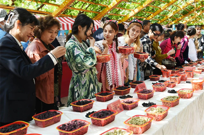 当天,在农产品展销现场,桑葚种植户木和塔尔·艾合买提忙得不可开交。“我们家种了200亩桑葚,今天我带来了黑珍珠、紫桑、小白桑等5个品种的桑葚,希望借助桑葚节这个平台把我们的农产品展示给更多的游客,也欢迎大家多来吐鲁番旅游。”木和塔尔笑呵呵地说。