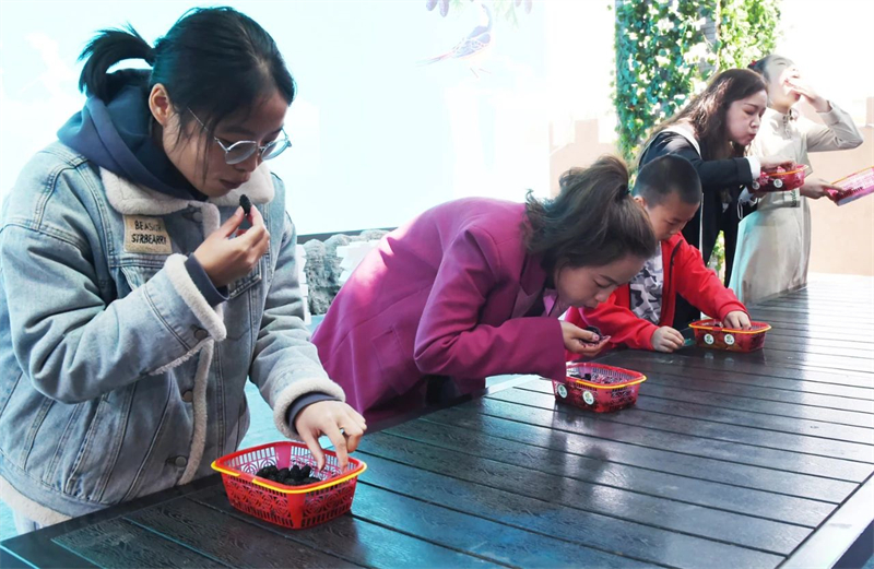 沐浴着和风暖阳,桑园中的桑葚流出了香甜的糖汁,游客徜徉其中,尽情享受采摘、品尝桑葚带来的甜蜜和乐趣。