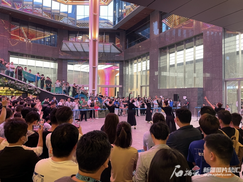 5月9日,欢快的新疆维吾尔木卡姆表演让深圳市科兴科学园D2栋小广场的人群沸腾了。当天18时,大型音舞诗画《掀起你的盖头来——新疆是个好地方》部分演职人员组成演出小分队走进这里,让科技企业员工近距离感受新疆歌舞乐魅力。